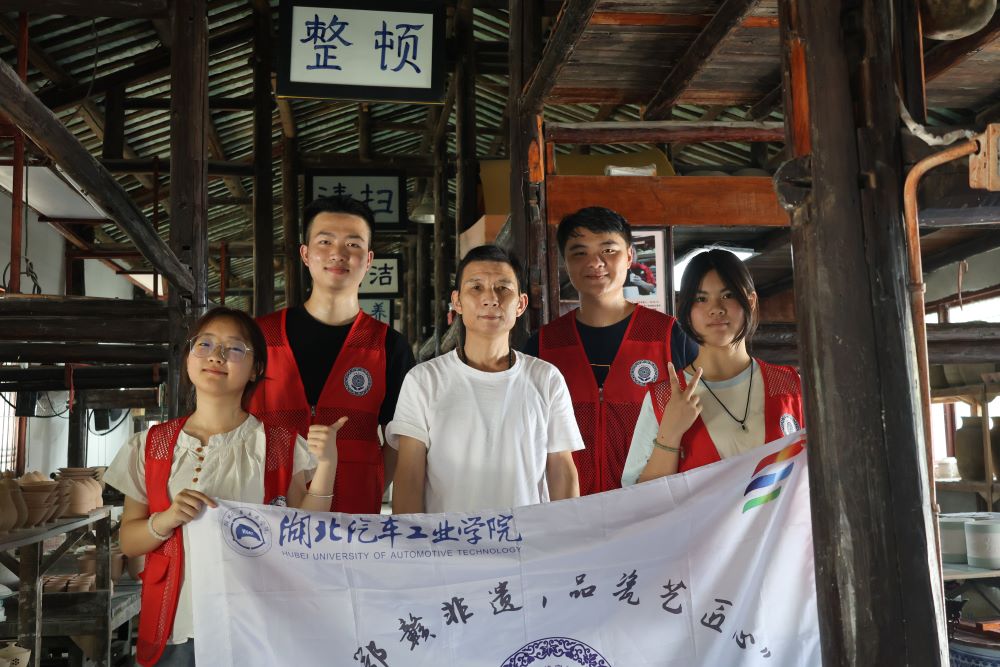 在7月8号,鄂赣瓷缘联队来到位于景德镇市古窑附近的鼎窑瓷画研究院,采访手工拉胚传承人冯绍兴。成员们叩响厚重的铁门,进入古色古香的庭院。左手边是进行艺术创作在瓶身上绘画的匠人阿姨们,右手边是包含了各式各样的工序的瓷器生产线。