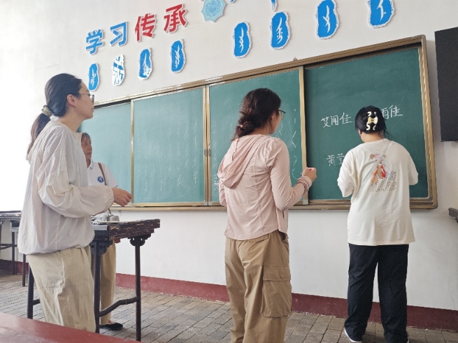 图为团队成员在黑板前书写女书 通讯员 许倩 供图 在这次实践过程中,实践队员们深刻认识到:传承非遗文化需要每一代人的努力。胡老师作为家传弟子,由奶奶教授女书字,她是第一代女书传承人。而到了现在,女书的学习不再局限于哪一位,同样也需要有更多的人关注,自发地来学习薪火相传,才能使这一项魅力无限的非遗文化继续流传千古。