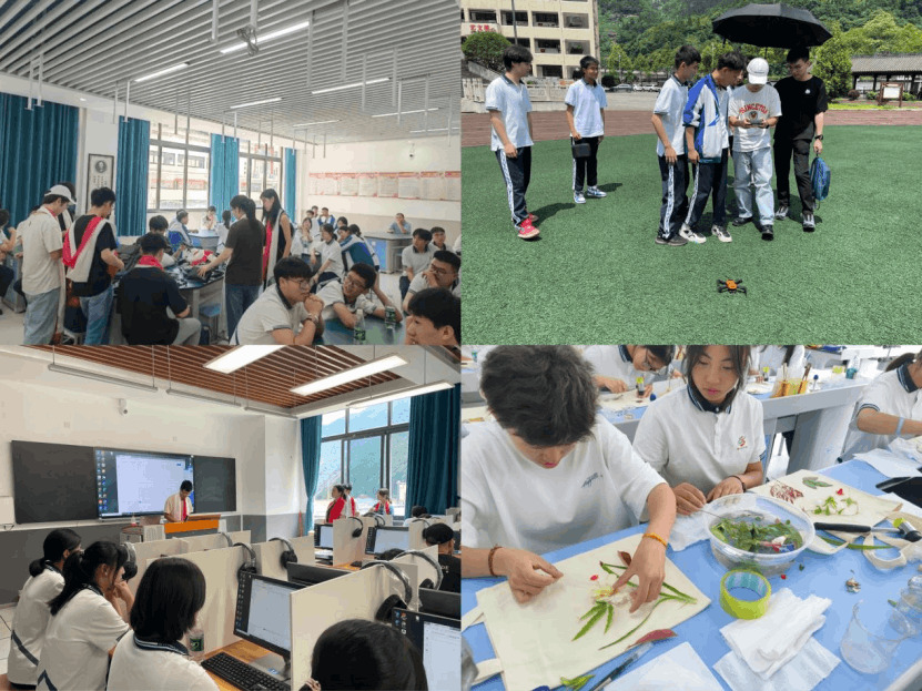 紧随其后,电子科技大学与香港大学的学生们为映秀中学的同学们带来了一系列精彩纷呈的互动体验:无人机展示、运动科技数据分析、科技教育交流、英语口语坊、生命叶拓帆布包等。无人机飞向湛蓝天空,拍下美丽的映秀中学和学生们可爱的笑脸,大家向无人机挥舞着双手拍照,留下最美好的回忆。运动分析APP精准记录学生跳远的运动图像和具体数据并给出调整建议。叶拓环节同学们把大自然的树叶与花朵通过拓印的方式留在帆布袋上,感悟人与自然和谐共生理念。