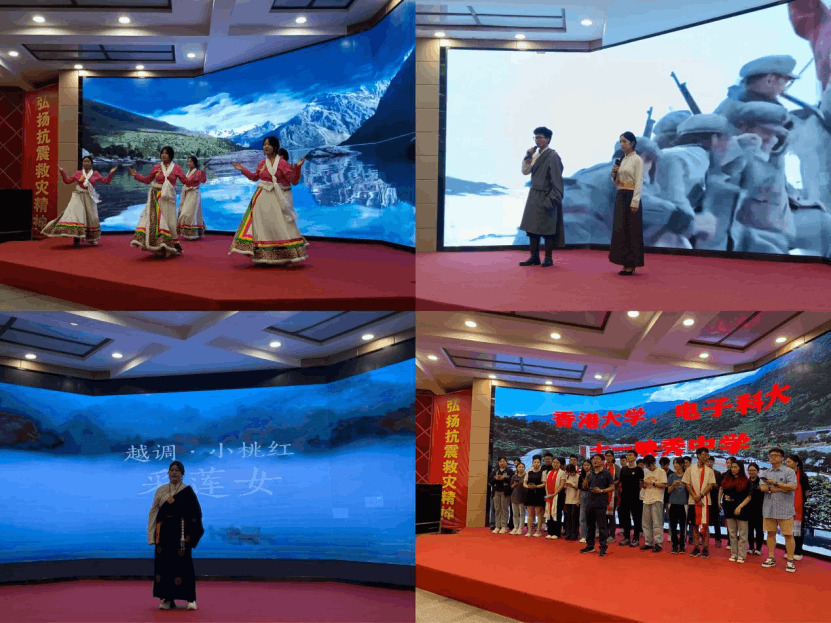 文艺汇演将活动推向高潮,七一映秀中学的师生们表演了《阿坝颂》诗朗诵、《吉祥的日子》藏羌歌舞、《采莲女》国风歌曲等,最后,由香港大学、电子科技大学与映秀中学三校同学们共同合唱了《我和我的祖国》,歌声悠扬,饱含深情,现场气氛热烈,场面十分感动震撼,共同讴歌新时代,充分展现了当代青年学子的爱国情怀与团结精神,为促进三地学生交流与文化融合搭建了良好的桥梁。