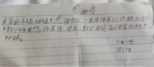 小学生上午的课程是由李旭刚老师和谭羽廷老师带来的写信。老师们鼓励学生们给自己感激的人写信,孩子们不仅写给自己的朋友,老师,父母,还不约而同的写给了支教老师:有的感谢老师数学课讲得好的,有的感谢老师手工课有趣味的,还有的甚至想给老师介绍对象的……