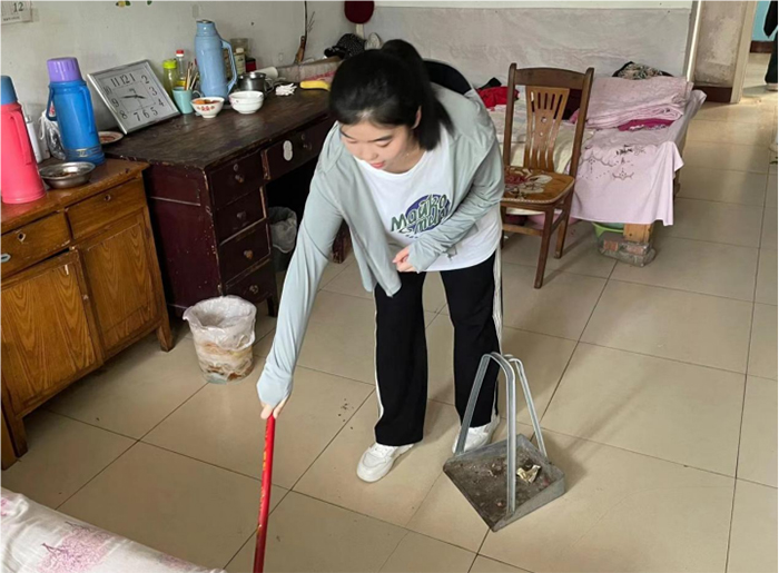 注:图为向阳计划实践团成员刘艺在打扫卫生