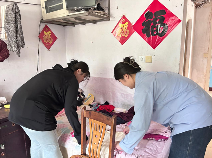 注:图为向阳计划实践团成员刘思萌刘晓丹在整理床铺