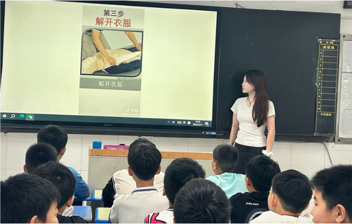尚怡安同学深知掌握心肺复苏技能对于挽救生命的重要性。在仓头镇中心学校,她通过精心准备的心肺复苏教学视频,为中小学学生们带来了一场生动而丰富的知识盛宴。