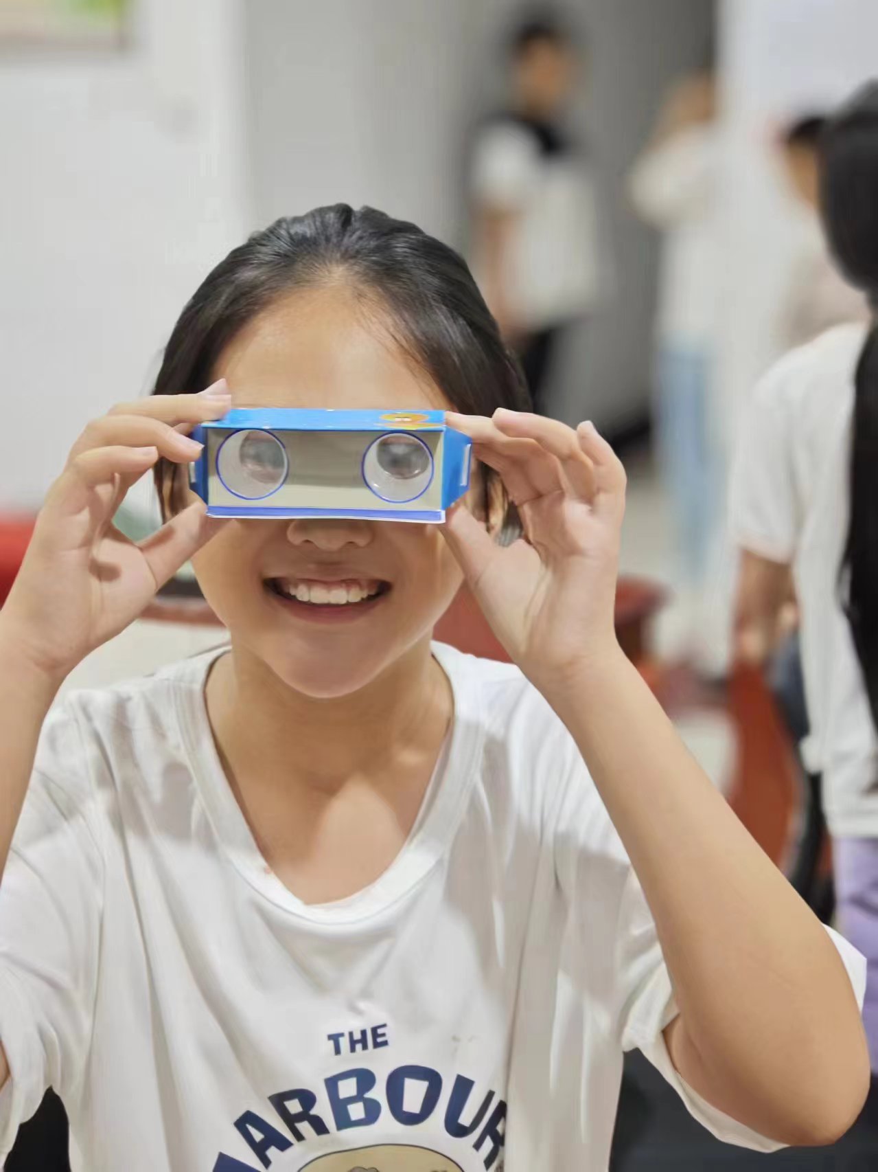 成员王财毅以引人入胜的方式详细阐述了望远镜的工作原理,激发了小朋友们对宇宙探索的无限好奇。随后,他巧妙地指导小朋友们利用纸壳、双面胶和透镜亲手制作出简易的纸壳望远镜,让他们在动手实践中体验科学的魅力。最后,他深入浅出地讲解了折射原理,帮助小朋友们理解光线在不同介质中传播时的奇妙变化,进一步拓宽了他们的科学视野。