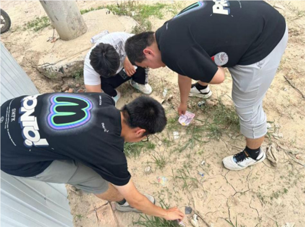图为实践团成员王太国,曹孟秋,李秉正于7月13日在进行清扫