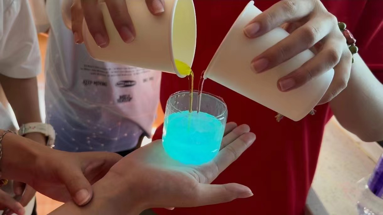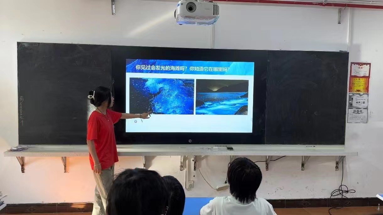 在探索了水的奥秘后,志愿者们借助一系列精心设计的动画与图片,为孩子们详尽阐述了“蓝眼泪”现象的由来。他们明确指出,“蓝眼泪”是由特定类别的浮游生物,如海萤与夜光藻,在夜晚遭遇外界刺激时所展现出的蓝色荧光现象。随后,志愿者们进一步讲述了“蓝眼泪”现象产生的条件,并强调了如何保护海洋环境以减少对这类生物的不利影响。为加深孩子们的理解与兴趣,志愿者们还通过鲁米诺反应实验,成功模拟了“蓝眼泪”的发光过程,让孩子们在暗处亲眼见证了蓝色光芒的奇妙展现。这一互动环节极大地激发了孩子们对自然界奥秘的好奇心与探索热情。