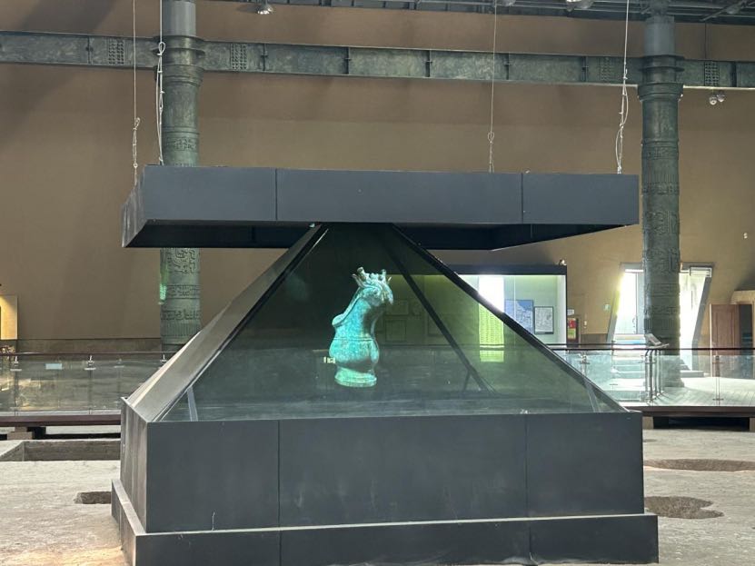 随后,实践团来到了与众不同的车马坑展区。不同于常见的车马坑,这里的马匹以站立姿态入葬,其形制独特,彰显了墓主人非凡的身份地位。依据周礼“天子驾六,诸侯驾四”的规制,推测该墓主人地位堪比诸侯,进一步证明了齐国作为东方大国的强盛与繁荣。