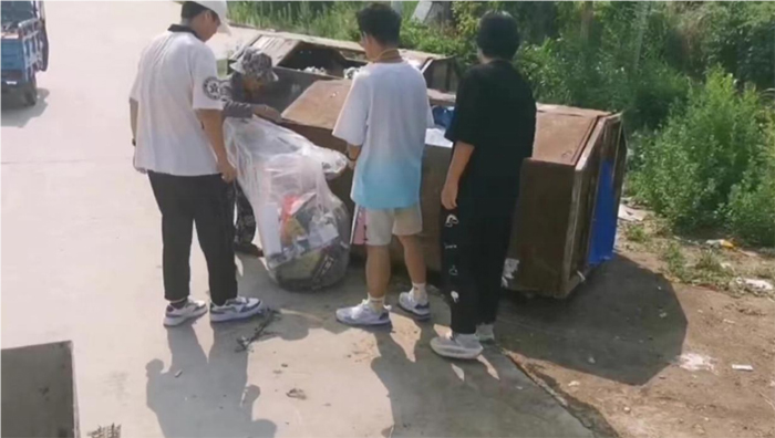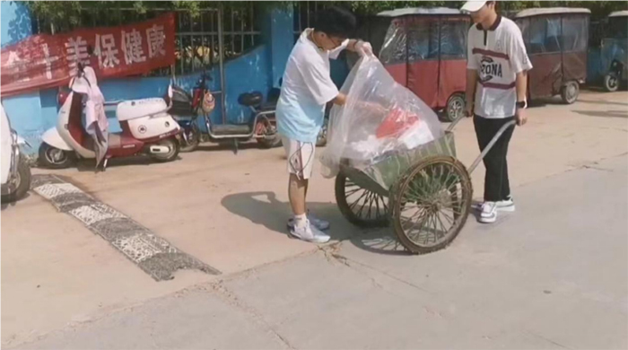图为基层服务实践团成员倒垃圾时偶遇拾荒老人并细心地将打扫街道的废品整理出来送给拾荒老人,展现了对弱势群体的关爱。通讯员 陈威宇 摄