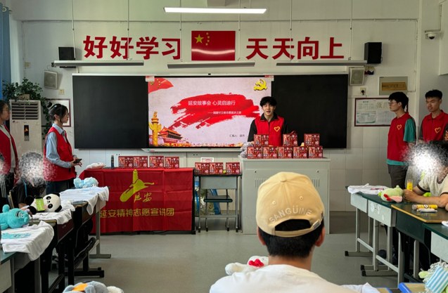 志愿宣讲团队组织开展了丰富多彩的系列宣讲活动,走进马鞍山市的中小学、大学等地进行线下宣讲。4月15日,志愿宣讲团队在安徽工业大学秀山校区开展“弘扬延安精神,传承红色基因”国旗下主题宣讲活动;6月22日,志愿宣讲团队奔赴马鞍山市特殊教育学校开展“延安故事会,心灵启迪行”宣讲活动,为特殊儿童讲解延安精神,让他们感受到勇气的力量,在孩子们的心中播下了希望的种子。