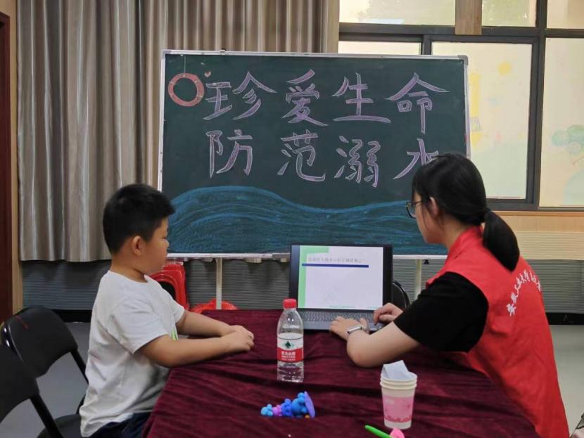 图为实践队员在对孩子们进行防溺水安全教育的照片。朱琛宇 供图