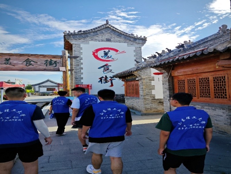 图为团队成员到达德百旅游小镇抵达德百旅游小镇后,实践团首先被其独特的建筑风格所吸引。小镇以传统与现代相结合的设计理念,打造了一系列充满特色的建筑群,既有古色古香的院落,也有现代感十足的休闲设施。漫步在小镇的街道上,空气中弥漫着淡淡的桑椹香气,让人心旷神怡。