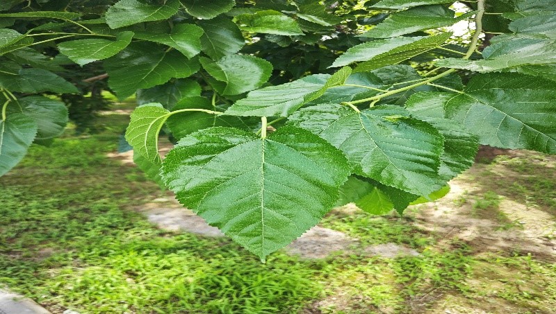 图为园内桑树叶在园林工作人员的热情介绍下,实践团成员们对桑椹树的认识更加深刻。他们了解到,桑椹树与夏津县的沙土地是天作之合。这里的土壤疏松且透气性良好,为桑椹树的生长提供了理想的条件。而桑椹树的存在,也远不止于其果实的美味,它们在这片土地上扮演着重要的生态角色,发挥着防风固沙的重要作用。员工们还详细阐述了桑椹树与传统果树生长方式的显著差异。不同于传统果树先长叶后结果的生长模式,桑椹树以其独特的生长习性,叶片与果实同步生长,使得在春天的暖阳下,桑椹树能够同时展现出翠绿的叶片与鲜嫩的果实,构成了一幅生机盎然的自然画卷。在聆听讲解的同时,实践团成员们积极提问,与员工们展开了深入的交流。他们思考着如何利用桑椹树的特性,推动当地农业的发展,为乡村振兴注入新的活力。
