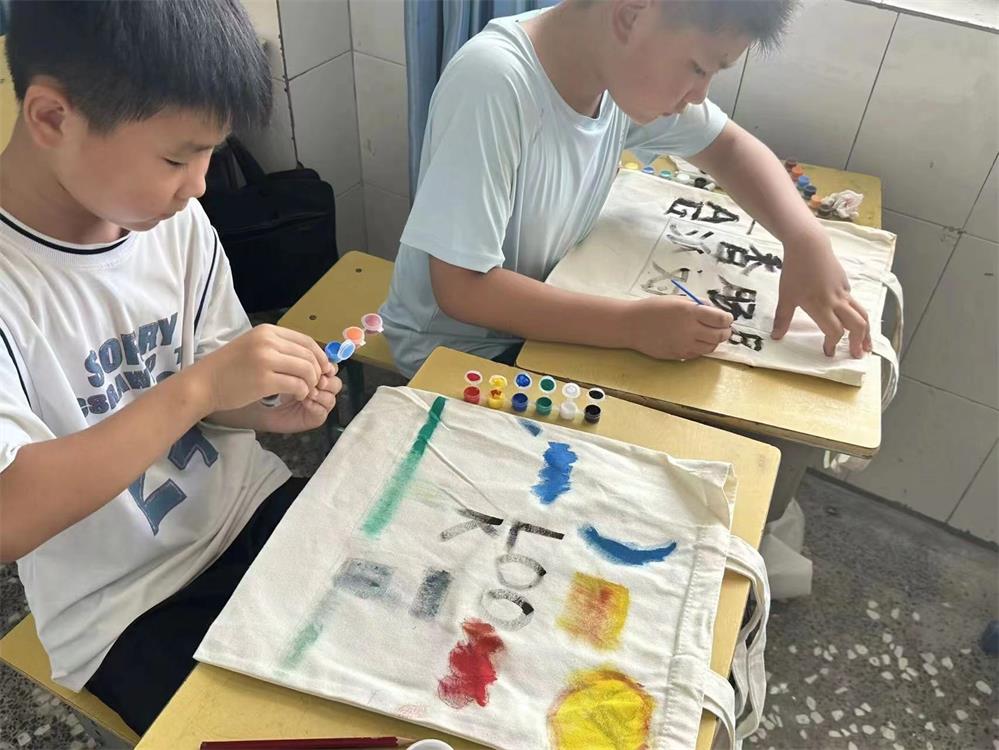 实践队队员带领学生们制作帆布包,帆布包的制作往往需要团队的合作与努力。在这个过程中,学生们之间积极交流,共同商讨设计方案、分工合作、互相鼓励。这种团队协作的精神不仅提高了工作效率,更增进了我们之间的友谊和信任,深刻体会到了集体的力量和温暖,让学生们深刻感受到了合作的重要性。