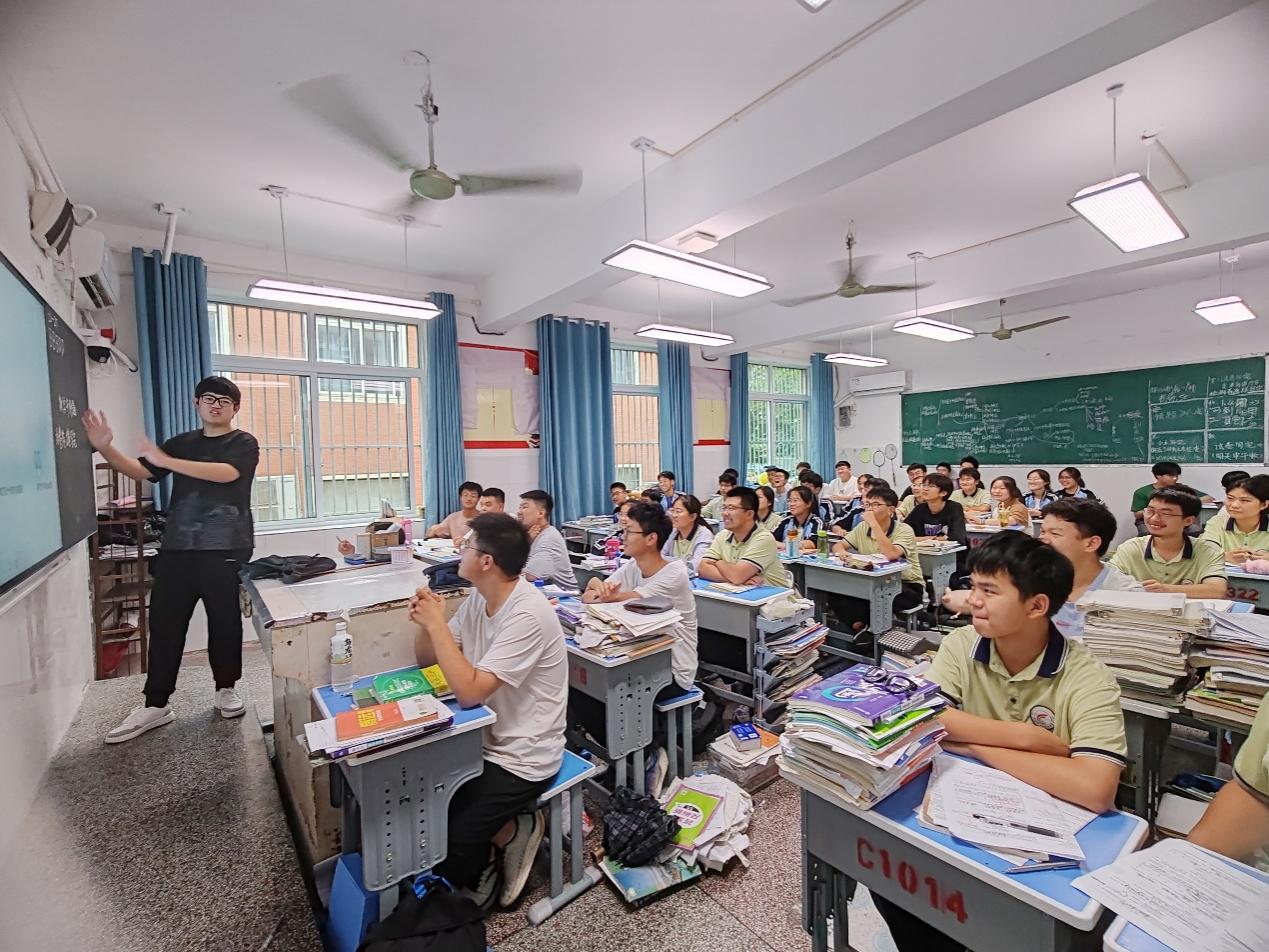 互动激热情,青春思辨展风采在母校的热情接待后,实践队伍满怀激情地走进了高中校园里的一间课堂。通过展示精心设计的PPT以及运用生动形象的讲解方式,讲解员详细介绍了习近平新时代中国特色社会主义思想的形成背景、主要内容和重要意义。在宣讲过程中,宣讲员注重将理论知识与现实生活相结合,用通俗易懂的语言和鲜活的事例阐述新思想的深刻内涵和时代价值。此次宣讲活动的宣讲内容既严谨又生动,不仅引起了同学们的强烈共鸣和热烈反响,还激发了他们学习新思想的浓厚兴趣和热情。为了增强宣讲的互动性和实效性,策划组还在宣讲过程中穿插了多个互动环节。实践队员鼓励同学们积极提问、发表看法和分享心得体会。针对同学们的问题,实践团队成员耐心解答、悉心引导,帮助他们更加深入地理解新思想的精髓和要义。实践团队还通过组织小组讨论、进行角色扮演等互动形式激发同学们的参与热情和创造力,让他们在轻松愉快的氛围中深化对新思想的理解和认识。