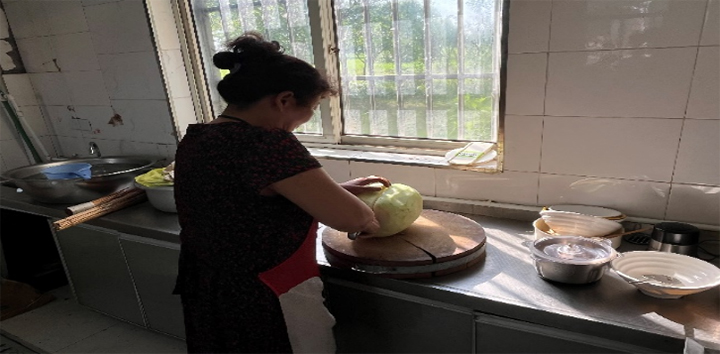 为了对养老院的环境有个大致了解,成员们随后参观了食堂,此时还是上午,食堂的工作人员正忙碌地准备今天的午餐。虾仁炒玉米、番茄炒鸡蛋、丝瓜毛豆汤……两荤两素一汤是这里的标配。“我们有专门的菜谱的,可以做到是一周七天不重样,还营养均衡。”厨师长骄傲地向推进团成员们介绍。