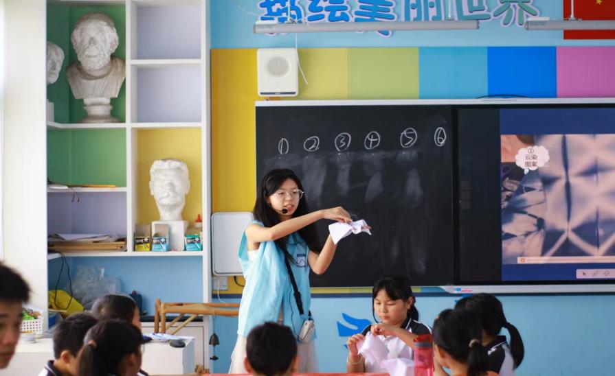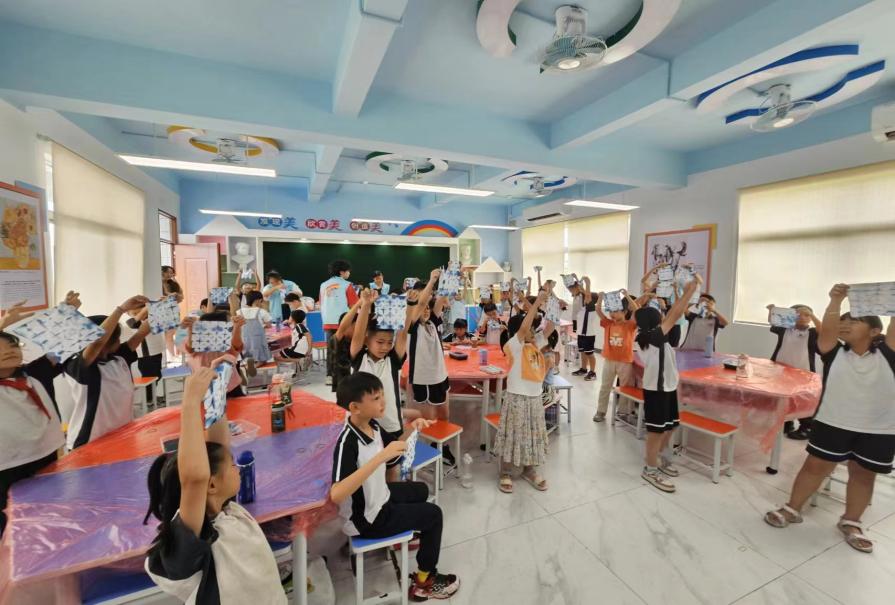 为加强非遗调查、记录和研究,加强非遗项目保护,积极向青少年一代推广非物质文化遗产,把扎染这一项优秀的非遗文化传承下去,2024年8月3日,华南师范大学物理学院团委学生会服务队在三下乡地点——星槎小学开展了“巧手扎锦绣,靛蓝染春秋”的非遗文化手工活动。