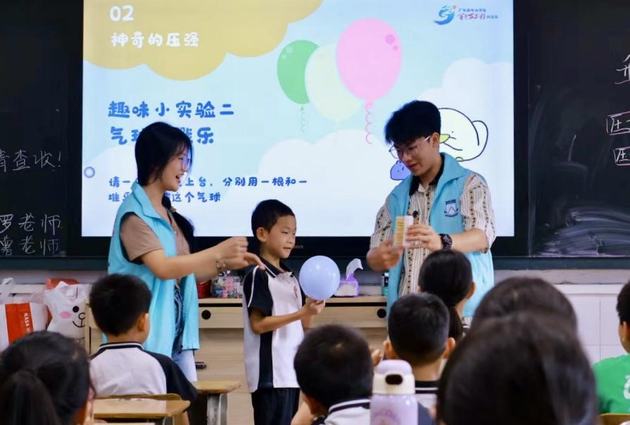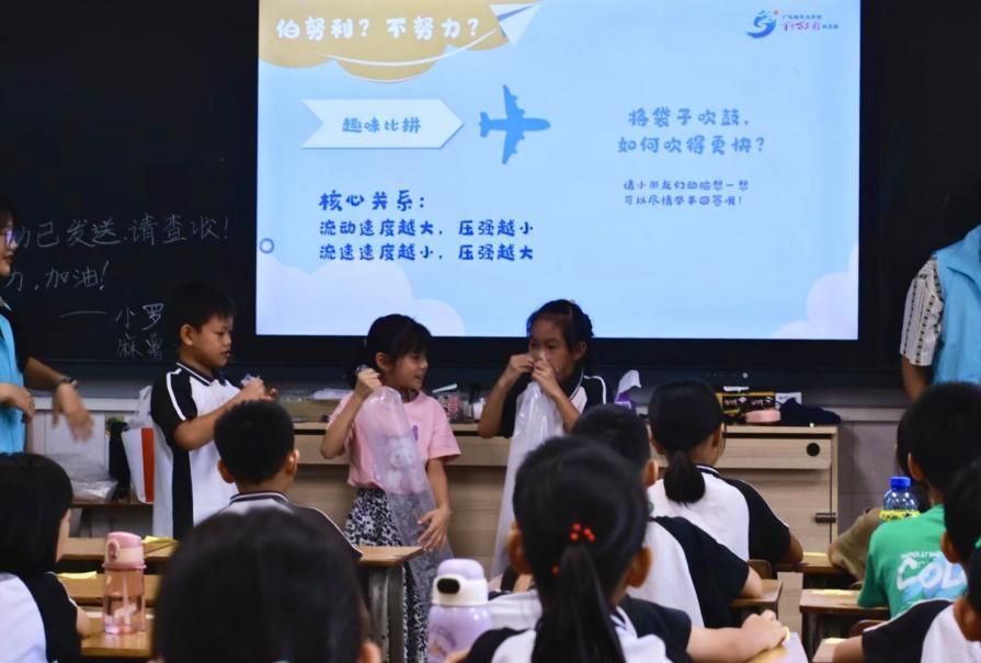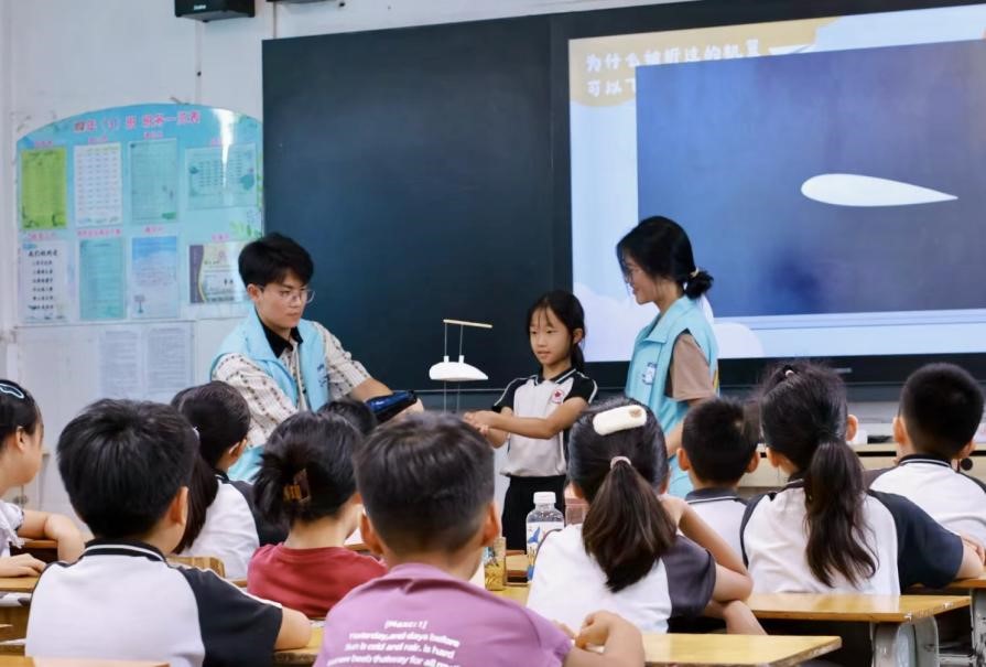 去年初夏,国产大飞机C919在上海虹桥机场成功起飞,落地首都机场,一百三十多位旅客共同见证了它的商业首航;今年盛夏,在广东“百千万工程”目标引领下,华南师范大学物理学院团委学生会服务队与星槎小学暑假成长营的小朋友们同聚一堂,共同探究C919大飞机翱翔天际的秘密。