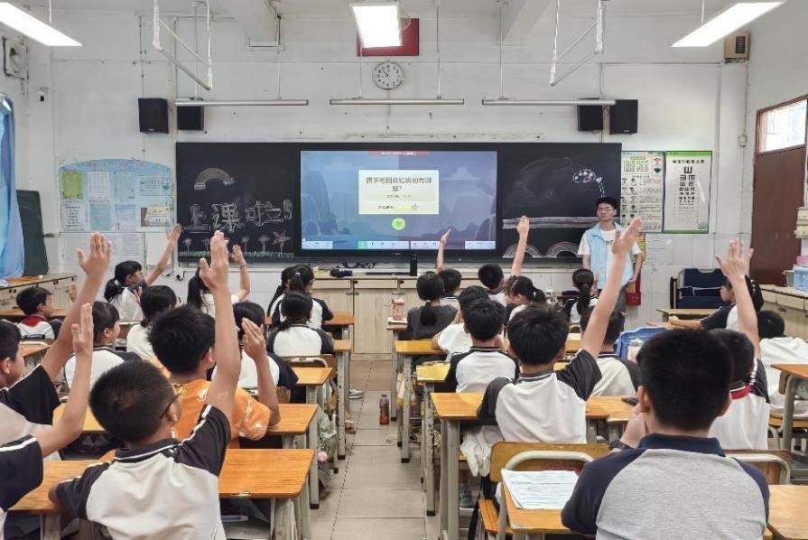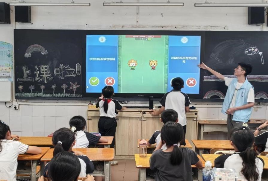 炎炎夏日,热情似火。2024年8月4日,在华南师范大学物理学院团委学生会服务队三下乡期间,华南师范大学物理学院团委学生会服务队成员陈祖烨(小叶老师)与潘可瑜(小潘老师),在星槎小学成长营里精心准备了一堂名为“垃圾去哪儿:我是分类小达人”的趣味劳动课程。本课程以环保知识为主体内容,通过垃圾分类教育,让同学们从小学会尊重和保护环境,培养他们的环保意识和社会责任感,为未来的环保工程打下基础。