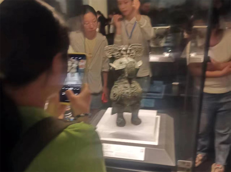 团队成员在参观交流并及时拍照记录后进入一楼二展厅夏商时期。妇好是中国历史上第一位有据可查的女性军事统帅、政治家。妇好离去后,武丁命人打造了一对鸮尊。它整体形状模仿猫头鹰的形象,身上布满八种纹样,栩栩如生。它不仅仅是一件艺术品,更是那个时代文化和信仰的载体。它的存在也揭示了商朝社会对女性地位的尊重和认可,对自然界的敬畏和对超自然力量的崇拜。