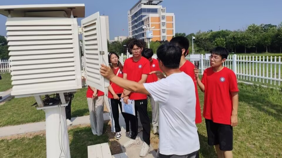 夏日炎炎,骄阳似火。酷热的暑气阻挡不了实践团队员求知实践的脚步,蒸发不掉队员们沸腾的热情。在东营市气象局大厅内,气象局相关负责人热情欢迎了我实践团一行。气象局张主任高度赞扬了我实践团不怕苦、不怕累,躬身实践的实干品质。在东营市气象局张主任和相关负责人的安排下,实践团成员首先参观了市气象观测站。张主任依次为成员们详细讲解了如称重式降水传感器、双翻斗雨量传感器等现代化气象观测设备的功能和操作方法、各类设备的测量原理等相关知识。实践团成员们了解了气象站工作人员的工作日常,对气象观测的重要性有了更加深刻的理解。