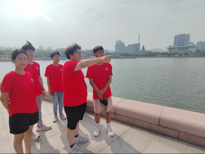 上午九时,在胡同学的带领下,实践团成员准时到达德州市明月湖进行实地调研。明月湖位于德州市中心,是一个集自然景观和人文景观于一体的综合性水利风景区,拥有丰富的水利和水文特征。同时,明月湖也是海绵城市建设的典范,通过海绵城市建设的技术手段,实现了对雨水的有效利用和排放,最大限度地减少了城市开发建设对自然水文特征和水生态环境的破坏。