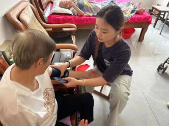 7月4日,为了关注老人们的身体健康,他们为老人们测量血压,按摩肩膀以及普及日常保健知识。对于行动不便的老人,成员们更是贴心照顾,帮忙喂饭、协助洗漱。