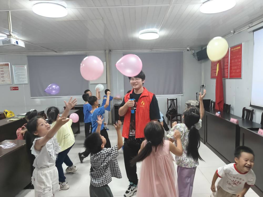 图为志愿者陪同小朋友玩拍气球游戏。通讯员 柯策水 摄