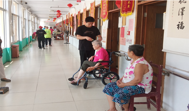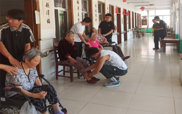 实践团成员们帮助老人捏捏肩,捶捶背使老人们得到放松,同时爷爷奶奶在实践团成员的搀扶下拉近彼此之间的距离,缓解了护理人员的工作量。