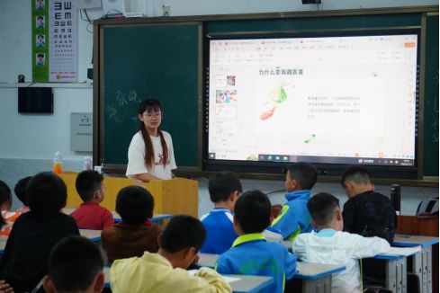 图为支教团成员徐倩倩教学同学们认识食物链 马杜供图