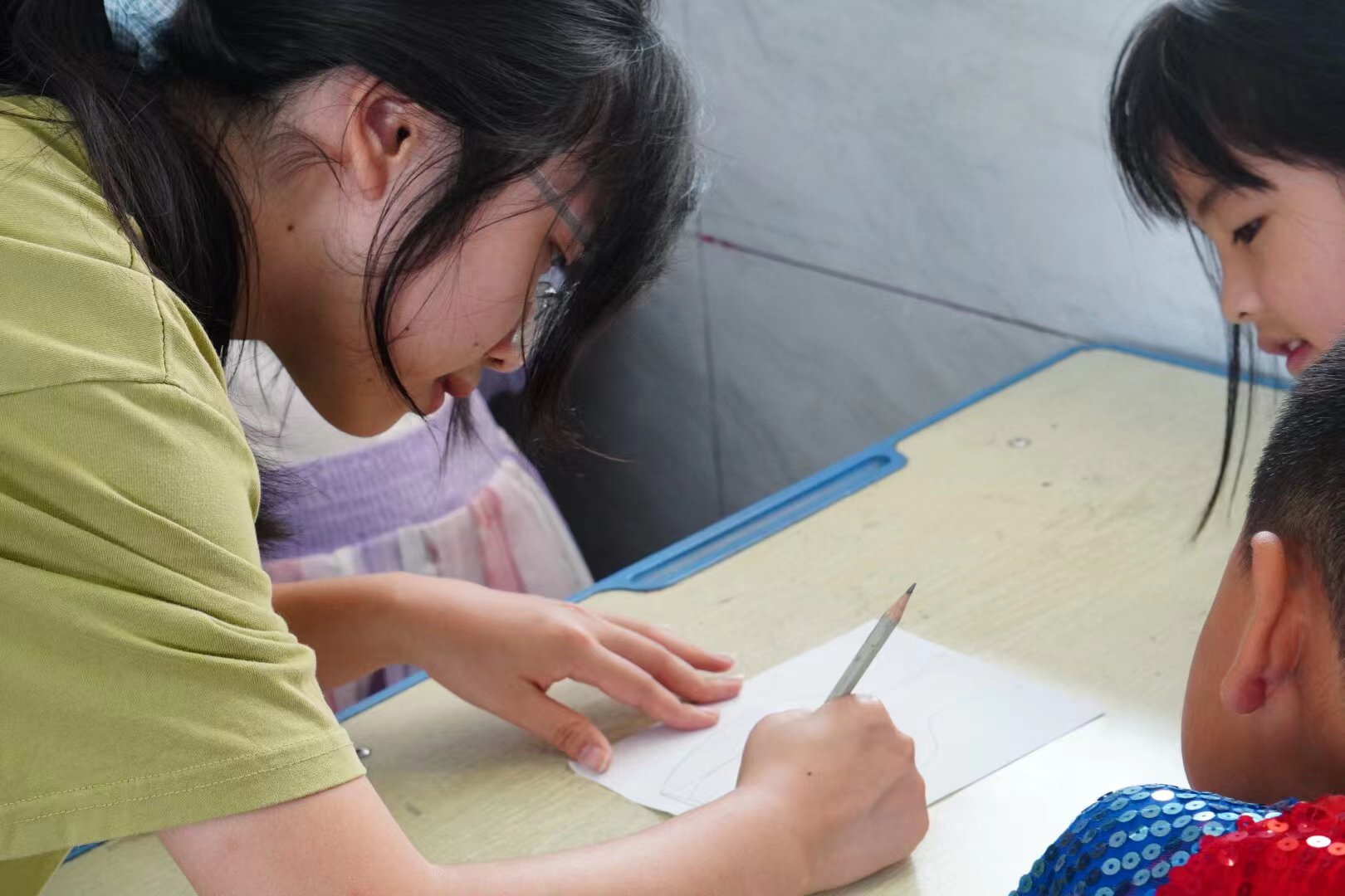 图为支教团成员徐倩倩教学同学们绘制民族服饰 张晓供图