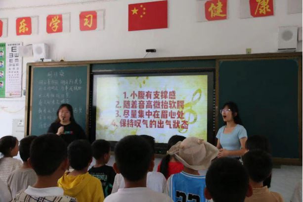 (图为支教团成员吴寿涵、李雨熙在指导孩子们进行课前开嗓 马杜供图)