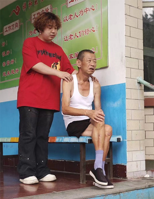 注:图为“阳光牧院“实践团成员沈诺弘在给老人按摩揉肩