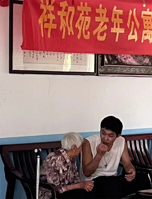 注:图为“阳光牧院“实践团成员冯号然在跟老人们唠嗑