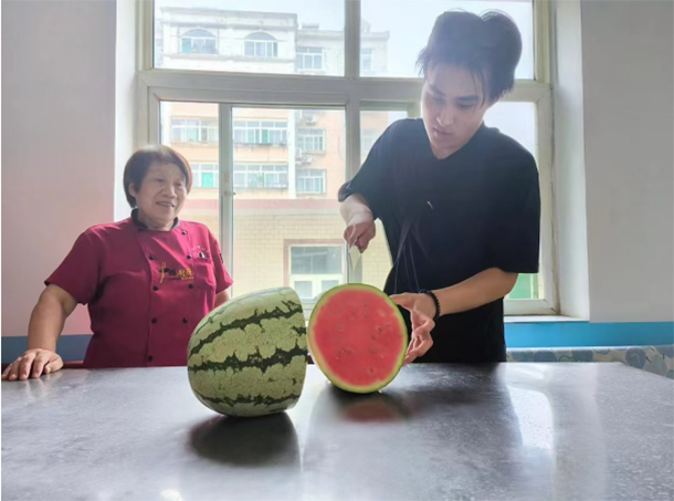 注:图为“阳光牧院“实践团成员王申奥为老人们切水果