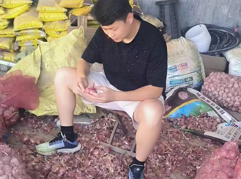 注:图一为“随枫”实践团成员党顺贺,商天乐,姜藩,孙潍方,孔顺,带旗帜合照 团队到达目的地后,首先实践团成员先和老人聊聊他们的日常生活,之后开始帮助老人剥蒜,在剥蒜期间老人们为实践团成员讲解大蒜的品质及剥蒜方式等等。