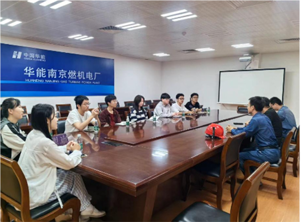 活动开始,在相关工作人员的带领下,小组成员前往了会议室进行相关讨论。座谈会伊始,同学们踊跃发言,提出了许多极富创意的想法和建议。同时,黄庆副总经理还与学生们共同观看了有关不同燃机工作的原理视频,并为大家介绍了华能南京金陵燃机电厂的历史。随后,在黄庆副总经理和赵飏副主任的带领下,成员们来到了燃机房。赵飏副主任详细介绍了燃机的工作原理、性能特点以及环保措施。他表示:“我们改进了过去的老式机组,采用与德国西门子联合发明的先进燃机技术,不仅大大提高了能源转换效率,还显著降低了排放污染,为实现‘双碳’目标贡献了力量。”