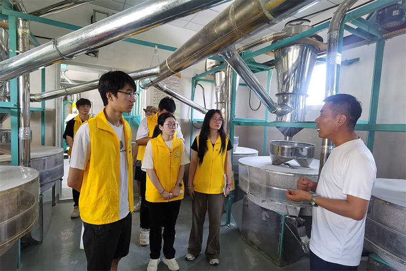 仪式后,团队前往润雪石磨面粉生产基地参观学习。该基地由联城镇“归雁人才”崔庆伟回乡创办。面粉以联城麦饭石土壤种植出的小麦作原料,通过传统麦饭石石磨进行研磨加工,最大程度保持所生产面粉的原生态。通过参观,实践团成员亲身感受到返乡创业人才助力乡村经济繁荣的现实图景。