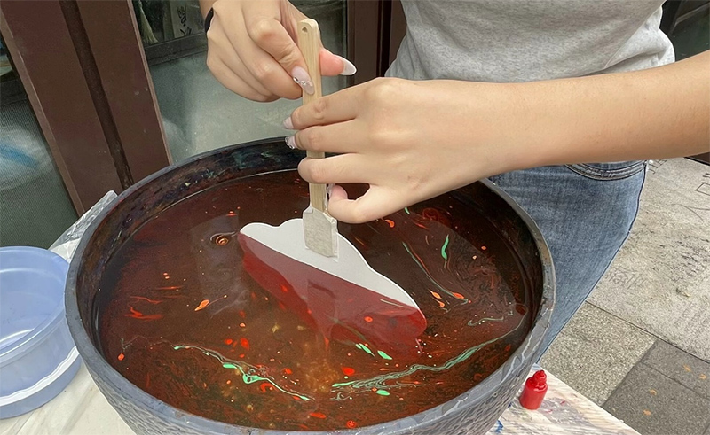 近年来,随着国潮的兴起和传统文化的回归,漆扇以其独特的艺术魅力和深厚的文化底蕴逐渐走进大众视野,带动经济增长,成为新时代的网红产品。如今由制作漆扇的漂漆技艺所延伸的网红漆扇,扇面上飘逸而无规律的水流线条完美诠释了什么叫中式“写意美”。如今的网红漆扇虽没有大漆工艺繁琐的加工步骤,但较简单、易上手,可以让大众都能体验,让更多人了解了这项非遗技艺,让每个人都能实现漆艺大师梦,这也是对非遗漆染工艺的一种创新传承和发展。