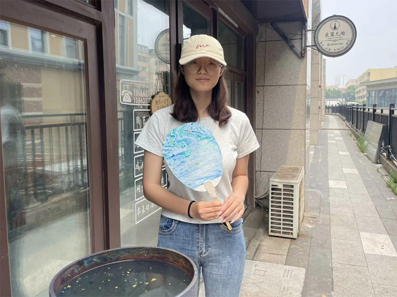 图为实践队员展示漆扇作品。庞竣珂 供图