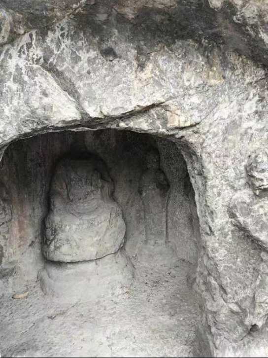 摩崖三佛龛七尊式造像,属于未完工的雕刻品。除本尊外,其余仅雕刻出躯体,但我们可以据此了解和研究石窟凿造的过程。值得一提的是,本尊倚坐式弥勒佛的两侧为胁侍立佛,此种布局造像也是石窟造像中罕见的题材之一。