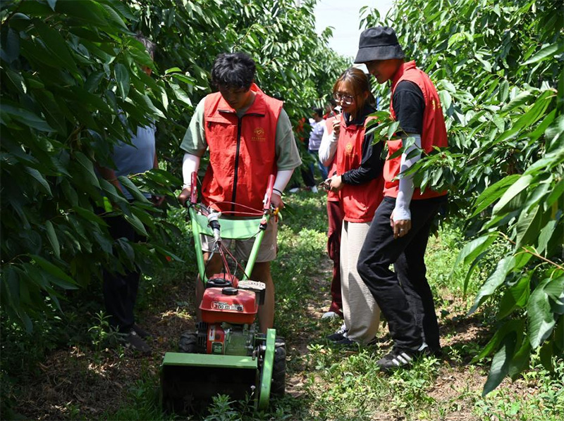 在体验期间,成员们在樱桃园还学习到了新的技能——使用除草机。在负责人的指导下,成员们了解到了哪些是杂草需要清除,哪些是涵养水土的草需要保留,拿起除草机便开启了消灭杂草工作状态。樱桃园中,成员们认真除草,与农民们一起扎根在园林中,农民们与实践团成员们不断交流互动,热心帮助成员们进行实践活动。