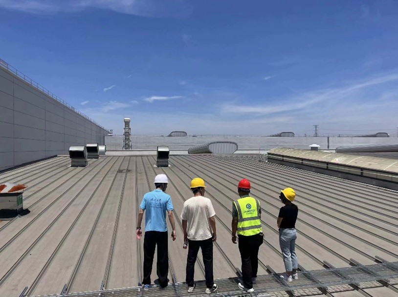 在任总与安全员的陪同下,成员们参观了公司在某生产基地屋顶的太阳能光伏电板安装施工现场。