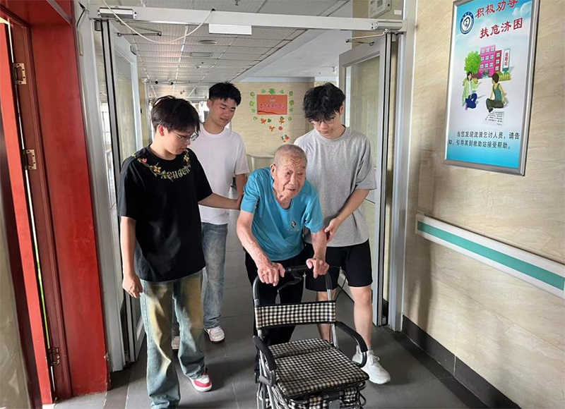 图为实践团成员帮行动不便的老人活动