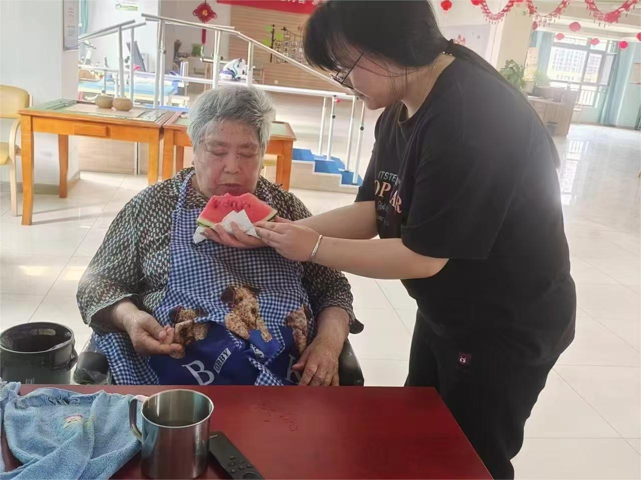 注:图为“银龄守护者”实践团成员王蕊在给老人分享西瓜在实践过程中,实践团成员们为老人们带来精心挑选的西瓜,将切好的西瓜块端到老人面前。随着西瓜的传递,养老院中弥漫着浓厚的欢乐气息。老人们与实践团成员们围坐在一起,分享着彼此的故事与经历。