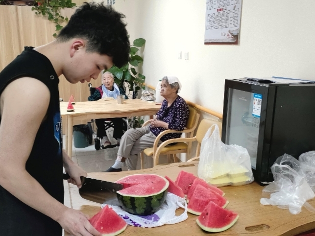 为了让老人们感受到夏日的清凉,实践团成员们特意准备了新鲜的西瓜,并亲自为老人切西瓜。