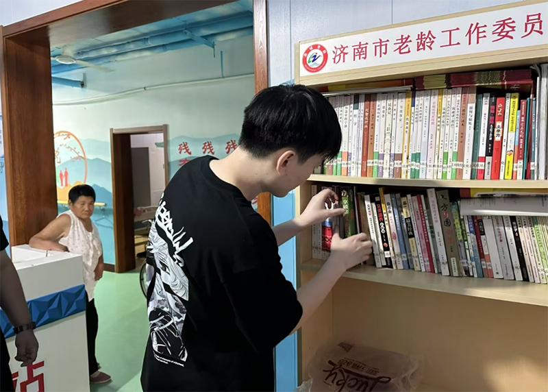 注:图为团队成团在爷爷奶奶们观看图书之后帮工作人员摆放图书