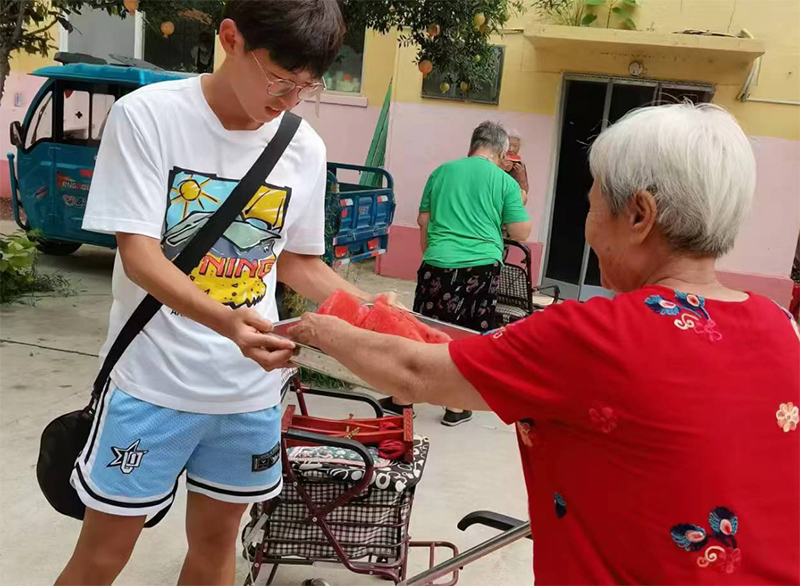 愉快的交谈,很快拉近了实践团成员们与老人的距离。实践团成员给老人带来水果进行分发。