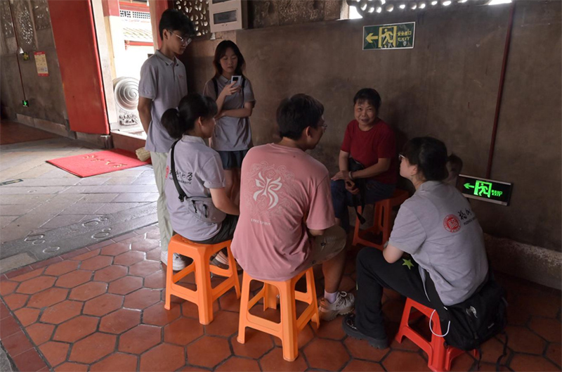 初入龙山寺时,实践队队员们遇见一位热心的工作人员,听说队员的来意后,他热情地进行讲解,据工作人员介绍,龙山寺距今已有千年历史,历经朝代变更,但仍香火不断。在交谈中工作人员特意提到了龙山寺在闽台交流中的重要作用。每月都有台湾的龙山寺僧人前来交流,他们共同举办佛事活动,互相学习。这种友好往来的交流,不仅加深了两岸佛教文化的交融,更促进了闽台关系的发展。为了深入了解这座古寺的历史与现状,实践队成员们纷纷提问,工作人员的讲解与各个殿堂的史料相辅相成,让实践队成员们收获颇丰。