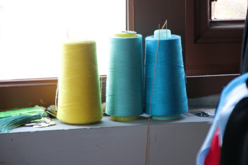 早晨9点,小分队抵达赫章县金银山街道彝族服饰文化馆,文创组、访谈组、记录组、摄影组全员就位,准备展开对以毕节市非遗扶贫就业工坊创始人杨小燕女士为主要采访对象的访谈实践。杨小燕女士还有客人接待,由杨女士的女儿先行带领小组成员对工作室进行参观。工作室干净整洁,一楼是整齐排列的彝族服装,供人参观、租借拍照以及买卖;二楼是收纳整齐的彝族服饰设计册、精心放置的奖杯证书、完成的和未完成的设计图纸……工作室上下两层大概一百平方米,整个空间被工作者安排得井井有条,纺织台与设计桌相隔不过中间凿空的一面墙,大大方便了灵感乍现时的快速实践需求。设计室的墙壁上悬挂着工作室出品的制作精良的彝族服饰成品,件件头饰精美,套套服装精良。